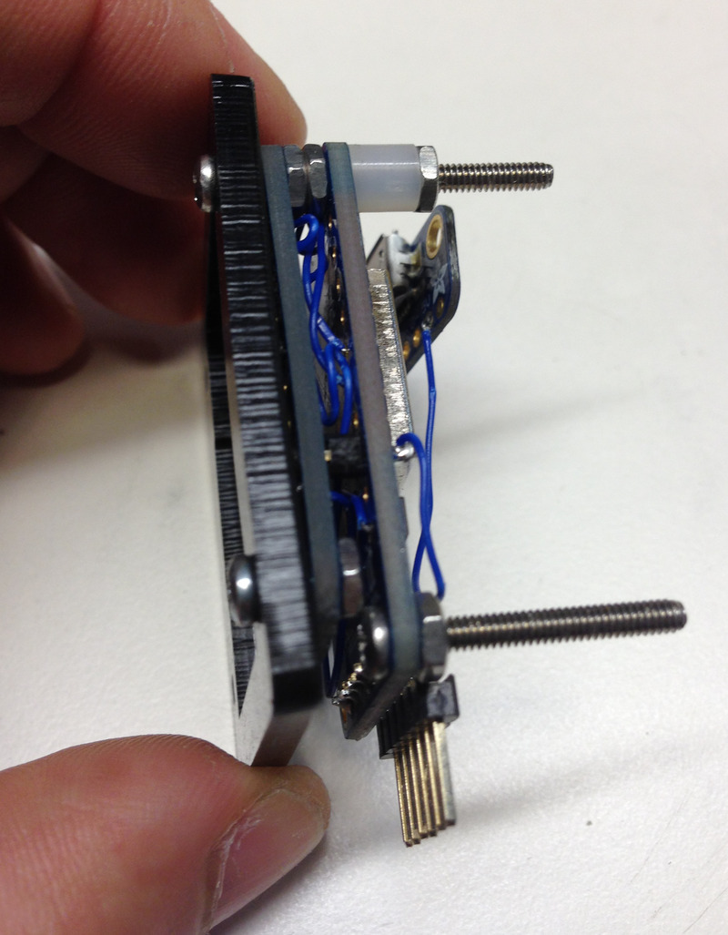 Attach the microUSB breakout to the other piece of lasercut acrylic. Use a 1/4" screw and hex nut to fix the left hole of the breakout to the acrylic on the side with the cutout notch. The cutout notch is there to allow a microUSB cable to connect.