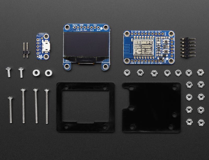 Start by putting a 1" screw through the top left hole (if the screen is facing you). This screw will go through all three breakout boards, lining them all up! Start by putting two hex nuts between the the OLED breakout and the Huzzah breakout and putting the screw all the way through. Don't overtighten though!