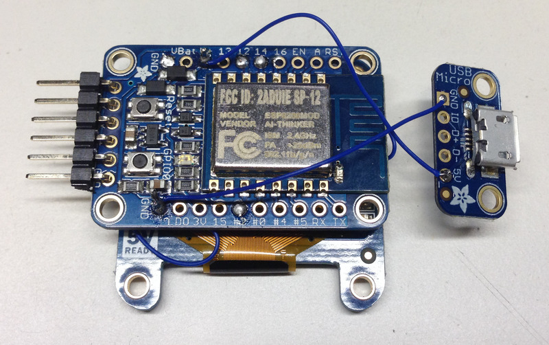 The goal is to solder the Huzzah and OLED breakout boards so that the OLED screen and Huzzah module are facing in opposite directions. The two buttons on the Huzzah need to be accessible to put the module into bootloader mode and program the Huzzah.