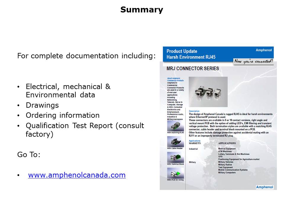 In summary, the design of Amphenol’s rugged RJ45 connector is ideal to use where Ethernet/IP protocol is used. With the options of right angle or vertical PCB, eight or ten contacts, LEDs or no LEDs, addition of terminal blocks and cable headers, EMI filtering, and transient voltage protection, this wide range of product offering provides a variety of choices to help meet any rugged RJ45 connector needs.