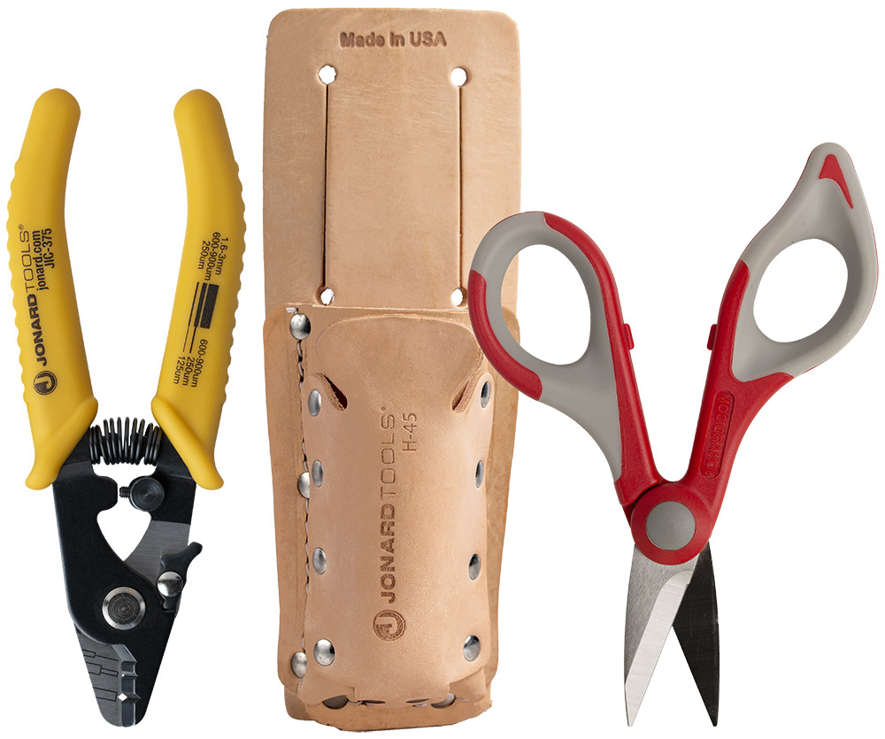 El kit de tijeras de fibra y Kevlar TK-355 de Jonard Tools incluye las tijeras de corte y de alambre JIC-186 y la tijera de fibra óptica de tres orificios JIC-375 en una práctica funda de cuero. El kit de tijeras y peladoras de fibra TK-355 es el kit de herramientas esencial para cualquier técnico de fibra.