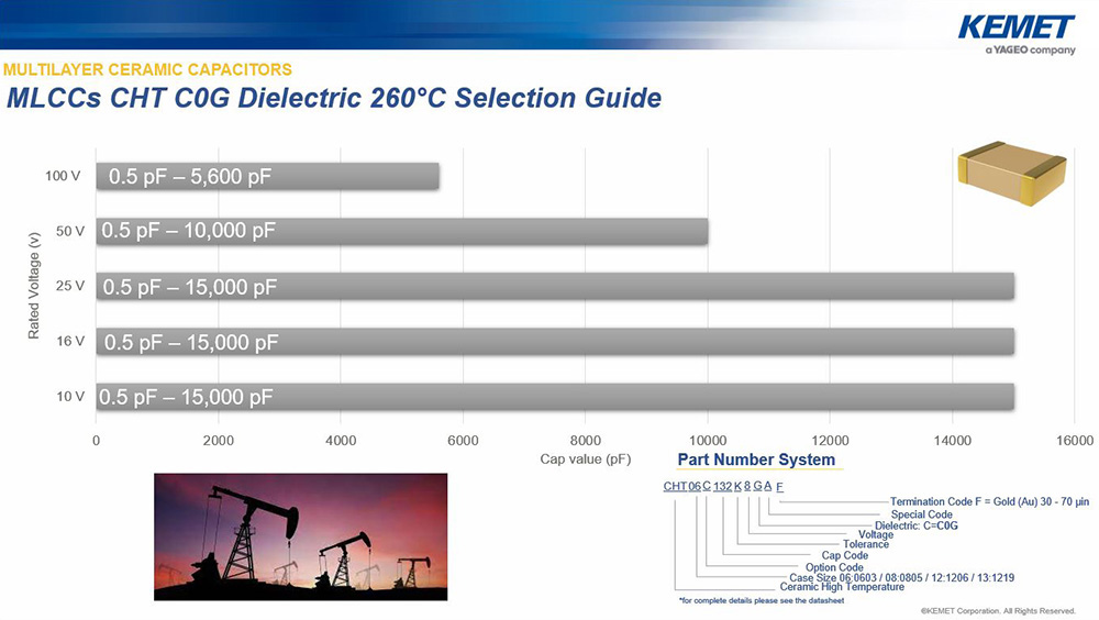 Los MLCC de KEMET soportan entornos industriales severos, como la exploración petrolífera de fondo de pozo y los circuitos del compartimento del motor de aviónica