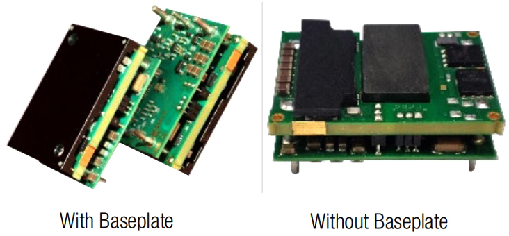 Características adicionales incluyen recorte de tensión de salida, protección contra sobrecorriente, sobretensión y sobretemperatura, protección contra fallo de puesta en marcha con pre polarización y modelos con o sin placa base.